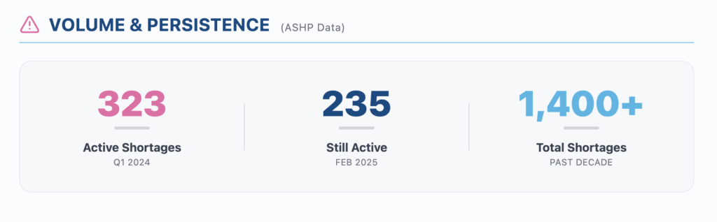 ASHP recorded 323 active shortages in the first quarter of 2024, with 235 still active as of February 2025, and more than 1,400 shortages in the past decade. As these pressures rise, coordinated processes give leaders the ability to anticipate risk earlier, guide frontline adjustments, and maintain stable care delivery across all sites.