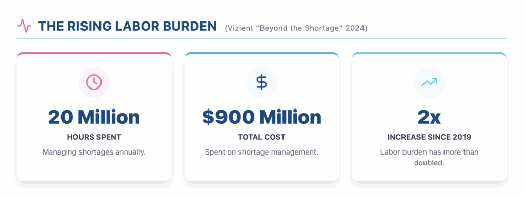 Drug shortages continue to strain hospital operations, budgets, and clinical teams. With 75% of pharmacy leaders citing shortages as their most urgent challenge and shortage-related labor costs approaching $900M each year, multi-hospital systems need stronger system-level coordination.