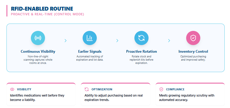 RFID’s impact depends on how data is operationalized. High-frequency scans replace calendar-based inspections, ensuring expiration visibility remains current without adding manual burden. Defined thresholds can trigger proactive removal or replenishment, shifting effort earlier in the lifecycle.