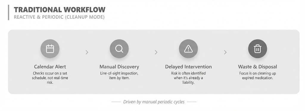 Manual inspection schedules leave long gaps between checks, allowing medications to move closer to expiration without visibility. In large hospital environments, these gaps are amplified by distributed inventory that spans pharmacies, procedure areas, crash carts, and mobile kits, where no single view reliably reflects true expiration exposure.