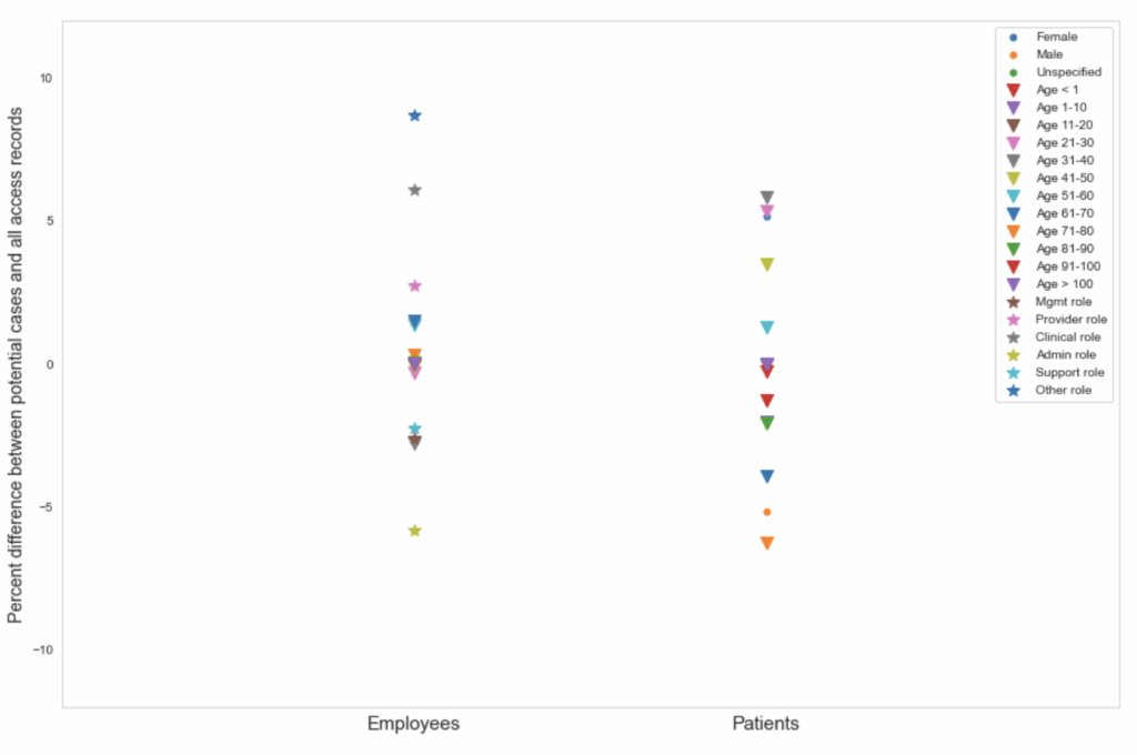 First, we assessed all activity versus activity flagged as “potential cases.” We calculated the proportion of employees in each employee segment (age, sex, role type) in both potential cases and in overall activity. For privacy cases, we made the same calculations for patient population segments by age and sex.