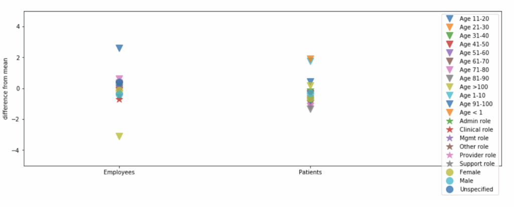 Despite these limitations, we decided to assess our analytics along population segments that we have access to: sex, age, and employee role information. We also considered using zip codes and length of employment, however these measures were ruled out due to difficulty of interpretation (though we would like to revisit this idea in the future), and unreliability of data, respectively. Our use of employee roles is based on the assumption that employee roles serve as a proxy for inherent hierarchical structures in healthcare which are also strongly correlated with socio-economic differences. Although this is admittedly an imperfect measure, we are optimistic that it is sufficient to rule out egregious bias in our analytics.